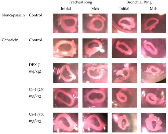 Table 3 and Figure 6 show the effect of Cs-4 on airway (trachea and bronchus) responsiveness in capsaicin-challenged rats. The capsaicin challenge increased the responsiveness of both tracheal and bronchial rings to Mch-induced contractions, as evidenced by significant increases in the effective concentration (EC50) by 99 and 96%, respectively, when compared with the unchallenged controls. The DEX treatment (1 mg/kg) did not produce any detectable effects on the airway responsiveness in capsaicin-challenged rats. The Cs-4 treatment (0.123 and 0.375 g/kg) significantly decreased the EC50 of the tracheal rings (47 and 88%) and bronchial rings (158 and 228%), when compared with the challenged and untreated controls.