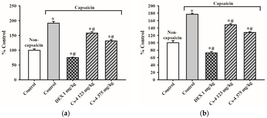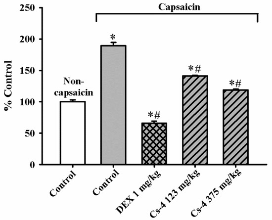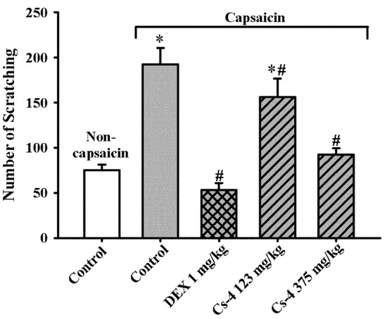 As shown in Figure 7, the capsaicin challenge triggered scratching behavior in rats, as evidenced by a significant increase (156%) in scratching events, when compared with the unchallenged controls. The DEX treatment (1 mg/kg) completely suppressed the capsaicin-induced stimulation of scratching behavior. The Cs-4 treatment (123 and 375 mg/kg) significantly reduced the number of scratching events by 31 and 85%, respectively, when compared with the challenged and untreated controls.