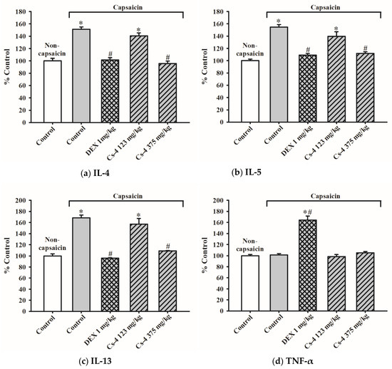 Figure 10 shows the effects of Cs-4 on various cytokine levels in the lung tissue of capsaicin-challenged rats. The capsaicin challenge caused increases in IL-4 (51%), IL-5 (55%), and IL-13 (68%) in rat lung tissues when compared with the unchallenged controls. No detectable changes in the tumor necrosis factor (TNF)-α and interferon (IFN)-γ were observed. The DEX treatment (1 mg/kg) completely suppressed capsaicin-induced increases in IL-4, IL-5, and IL-13 levels in rat lung tissues and significantly increased the levels of TNF-α (64%) and IFN-γ (34%), when compared with both the unchallenged control and the challenged/untreated controls. The Cs-4 treatment almost completely suppressed the capsaicin-induced increases in IL-4, IL-5, and IL-13 levels in rat lung tissues at a dose of 375 mg/kg.
