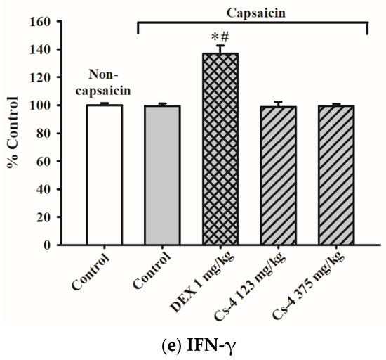 The effect of Cs-4 on various cytokine levels in the lung tissues of capsaicin-challenged rats. Data were expressed as the control percent of noncapsaicin rats, with the control values being (a) 367.6 ± 15.9 pg/mL (interleukin (IL)-4), (b) 368.1 ± 9.22 (IL-5), (c) 18.7 ± 0.67 pg/mL (IL-13), (d) 354.8 ± 7.39 pg/mL (tumor necrosis factor (TNF)-α), and (e) 745.6 ± 10.37 (interferon (IFN)-γ). Each bar represents the mean ± S.E.M., with n = 8. * Significantly different from the noncapsaicin control group. # Significantly different from the capsaicin control group.