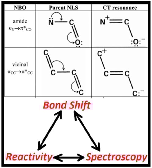 Resonance-type aspects (ii), (iii) of electronic bond shifts can be further quantified with the descriptors of natural resonance theory (NRT) [13,14,15], particularly the fractional bond orders {bAB} and resonance weightings {wR} that allow continuous tracing of a bond shift from one limit to another along a reactive pathway. Such resonance-type NBO/NRT bond shifts of nN-π*CO or πCC-π*CC type are well-known to profoundly influence the structural, reactive, and spectroscopic properties of amides or polyenes, respectively.