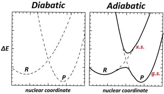 Schematic two-state coupling model of “diabatic” (localized bond) potential curves (centered at distinct R, P positions along a reactive pathway) that interact vibronically to give final “adiabatic” potential curves for ground (g.s.) and excited (x.s.) spectroscopic states.