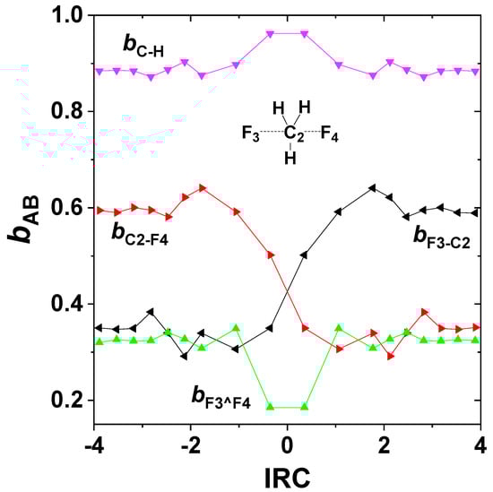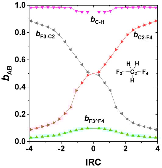 One can also evaluate the NRT bond orders along the IRC to visualize the continuous changes of bCF, bCF’, bCH on the ground-state potential, as shown in Figure 5. The bCH (violet) bond orders vary only slightly from unity near the transition state, whereas the complementary bCF, bCF’ (red, black) bond orders vary steeply between near-zero and near-unit values in reciprocal manner. Also shown are the bF^F’ (green) “long-bond” orders (a surprising form of 3c/4e interaction [63]), which contribute appreciably to stabilizing the transition-state region.