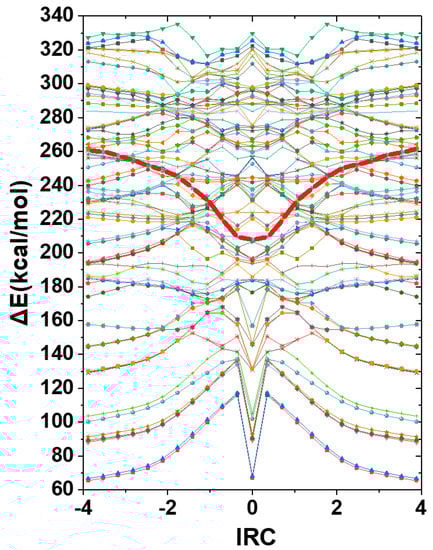 Excitation diagram for the 100 lowest TD roots along the IRC of methyl fluoride SN2 exchange reaction (24), showing (in dark-red connecting lines) the band of bright roots of maximal oscillator strength (sharply distinguishable from the many adjacent or interleaving dark roots of negligible intensity) that are taken as the spectroscopically significant “ℇx.s.(TD) excited state” for present purposes. (See SI for TD root-numbers of connectedpoints along the bright spectral sequence.).
