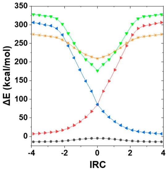 - Fukui, K. The path of chemical reactions—The IRC approach. Acc. Chem. Res. 1981, 14, 363–368. [Google Scholar] [CrossRef]