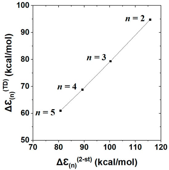 Figure 10 displays the near-perfect linear correlation between two-state Δℇ(n)(2 − st) vs. full TD Δℇ(n)(TD) descriptors (Table 4) of n-dependent cyanine chromophores. The displayed correlation, with Pearson correlation coefficient |χ|2 = 0.9996, corresponds to a least-squares regression fit