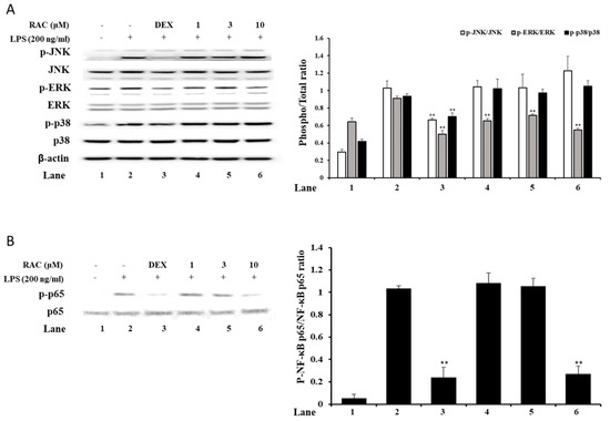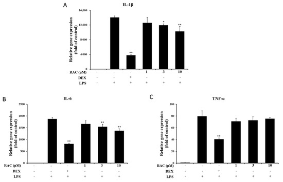 Effect of RAC on LPS-induced proinflammatory gene expression. J774A.1 cells were treated with 200 ng/mL LPS after pretreatment with 10 μM dexamethasone or 1, 3 or 10 μM RAC for 1 h. (A) IL-1β, (B) IL-6 and (C) TNF-α gene expression was determined by quantitative real-time PCR. The data were normalized to 18S rRNA expression and are presented as the fold change compared to the untreated group. The results are presented as the mean ± SD of three individual experiments. * p < 0.05, ** p < 0.01 compared with the LPS only-treated group. DEX, 10 μM dexamethasone.