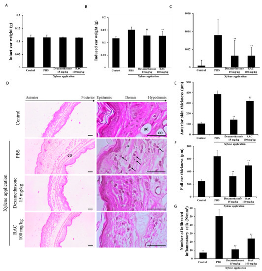 Xylene-induced ear edema is a simple and classic model for acute inflammation studies. It is widely used to evaluate the anti-inflammatory activities of substances [16]. In this study, we assessed the anti-inflammatory effect of RAC on a xylene-induced ear edema model. The administration of PBS, dexamethasone and RAC did not affect intact ear weights (Figure 4A). The xylene application induced ear weight and differences in ear weight, but dexamethasone and RAC significantly decreased them compared with those of the xylene-only-treated group (Figure 4B,C).