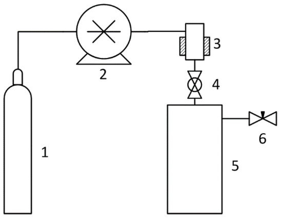 The scheme of the apparatus for rapid expansion of supercritical suspensions: 1 is the CO2 source, 2 is the CO2 pump, 3 is the suspension chamber, 4 is the 1.5 mm spray nozzle, 5 is the atmospheric pressure precipitation vessel, and 6 is the valve.