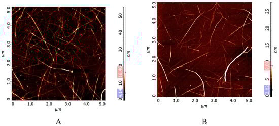 Carbon nanotubes atomic force microscopy (CNT AFM). Before (A) and after (B) CO2 processing at a pressure of 75 bar and a temperature of 80 °C.