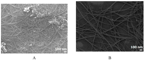 CNT SEM images. before (A) and after (B) CO2 processing at a pressure of 75 bar and a temperature of 80 °C.