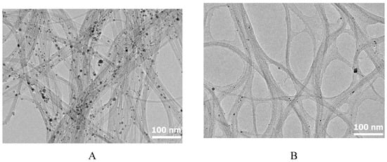 CNT TEM images. before (A) and after (B) CO2 processing at a pressure of 75 bar and a temperature of 80 °C.