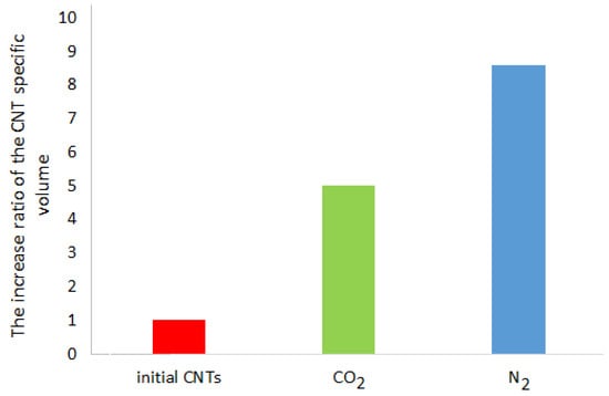 The increase ratio of the CNT specific volume after RESS (Rapid Expansion of Supercritical Suspensions)-processing (100 bar, 40 °C) using CO2 and N2.