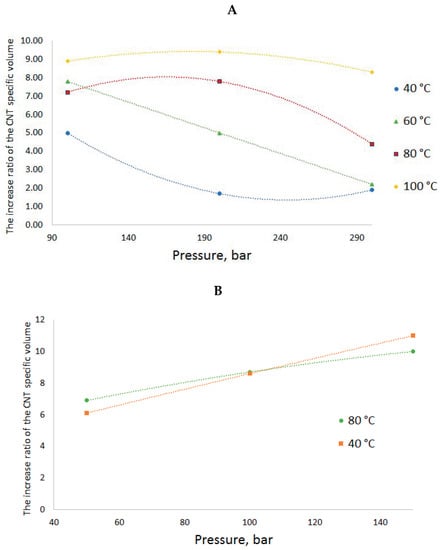 Depending on the RESS conditions, the increase in the specific volume of CNTs can vary within a wide range of values. The obtained ratios of the increased specific volume of the CNTs to its initial value depending on the RESS conditions are given in Figure 6.