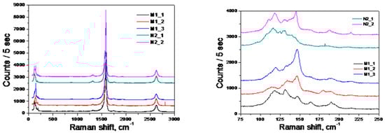 CNT Raman spectra before and after RESS-processing. N2_1 and N2_2 refers to the starting nanotubes, M1_1, M1_2, and M1_3—to the nanotubes after the RESS-processing with CO2 at a pressure of 75 bar and temperature of 80 °C.