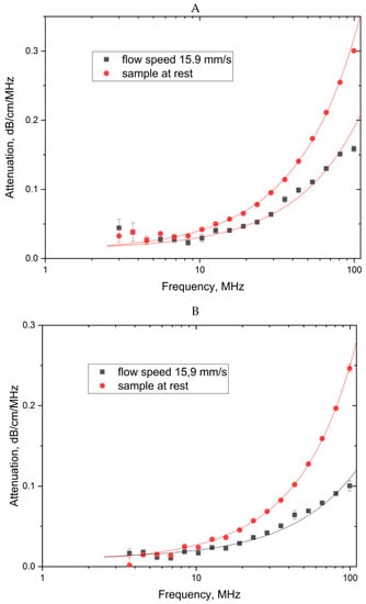 Ultrasound attenuation spectra measured in a CNT dispersion: The red lines denote the spectra obtained at a random alignment of the nanotubes, the black ones show the spectra reflecting the nanotubes predominantly aligned along the flow, perpendicular to the ultrasonic wave direction. (A)—CNTs before RESS, (B)—CNTs after RESS.