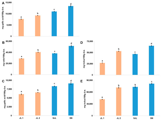 Characteristics of the phenolic components and antioxidant abilities of Rhodiola (JL1, JL2, SJL, and SN). (A): Total phenols; (B): Total flavonoids; (C): Total tannins; (D): DPPH antioxidant ability; (E): ABTS antioxidant ability. Gallic acid was used as a standard for the total phenols and total tannins. Rutin was used as a standard for the total flavonoids. Trolox was used as a standard for the DPPH and ABTS antioxidant abilities. Results are presented as the mean ± SD of three independent experiments (n = 3) and are expressed as mg standard per 100 g d.w. of plant material. In each column, different letters (a, b, c, d) mean significant differences between two groups (p < 0.05) found via a T-test. Note: Rhodiola samples are presented according to the ascending order of altitude from left to right.