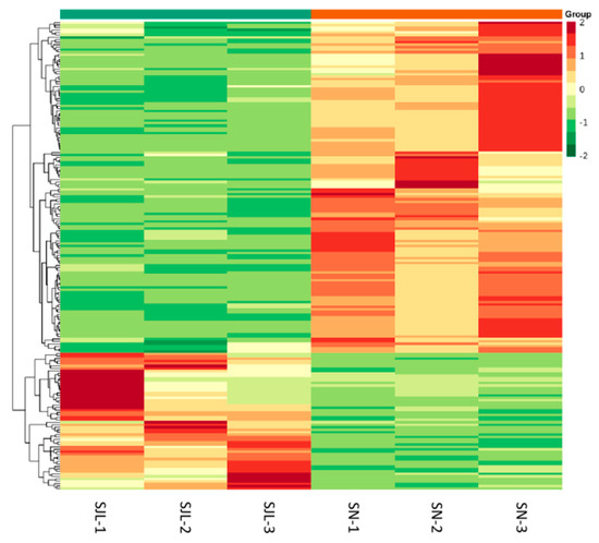 The recognized differential metabolites between SJL and SN were further subjected to heatmap analysis to picture their relative contents (Figure 5). As shown in Figure 5, SJL sections composed of red and green color-coding are clearly distinguishable from those of SN, demonstrating significant differences in the relative contents of differential metabolites between SJL and SN.