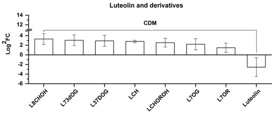 Eight CDMs were categorized as luteolin or its derivatives and are displayed according to the order of the FC value from left to right in Figure 7. As shown in Figure 7, all were upregulated with the exception of the rightmost luteolin being downregulated. The characteristics of luteolin and its derivatives were found to be similar to those of kaempferol and its derivatives; however, a difference was found for the downregulation of luteolin, namely the aglycone. This may suggest that a rise in altitude intensifies the biosynthesis of luteolin glycosides in Rhodiola crenulata via using luteolin as a potential substrate.
