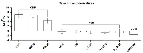Comparison of nine catechins and catechin derivatives, including 4 CDMs and 5 non-differential metabolites (Non) between SJL and SN. Upregulation denotes that the content of a metabolite increased in SN compared with that in SJL, and the opposite for downregulation. The Y-axis is exhibited as Log2FC values for the convenience of visual presentation (note that the up and down amplitudes in the text refer to the FC value). The X-axis denotes the metabolite names. Abbreviation: GCG, (−)-gallocatechin gallate; EGCG, epigallocatechin gallate; G3OG, gallocatechin 3-O-gallate; l-EC, l-epicatechin; CG, catechin gallate; (−)-CG, (−)-catechin gallate; (−)-ECG, (−)-epicatechin gallate; (−)-EGC, (−)-epigallocatechin.