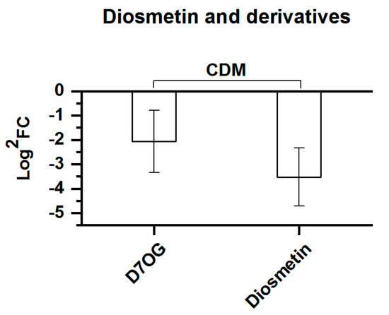 Comparison of diosmetin and its derivatives, comprising 2 CDMs between SJL and SN. Downregulation denotes that the content of a metabolite decreased in SN compared with that in SJL. The Y-axis is exhibited as Log2FC values for the convenience of visual presentation. The X-axis denotes the metabolite names. Abbreviation: D7OG, diosmetin-7-O-β-d-glucopyranoside.
