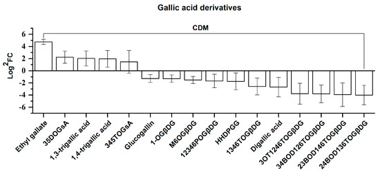 Sixteen CDMs were categorized into this class, containing gallic acid derivatives and hydrolyzed tannins formed by gallic acid and glucose. These 16 CDMs are presented according to the order of their FC value from left to right in Figure 10. As shown in Figure 10, it is apparent that the number of downregulated CDMs is much higher than that of upregulated CDMs (11 downregulated versus 5 upregulated). Furthermore, in terms of the FC values, the 11 downregulated CDM FC values ranged from 0.06–0.41 for the calculation between SN/SJL (also presented as 16.11–2.43 after the conversion of SN/SJL to SJL/SN for the convenience of comparison), which is generally greater than the FC value range for the 4 upregulated CDMs (4.68–2.75), with the exception of 26.64 for ethyl gallate. For the 11 downregulated CDMs, regarding the FC value ranges of five CDMs, namely the CDMs of glucogallin and HHDP-galloylglucose (HHDPGG) and those between them, their values were close to those of the upregulated CDMs, besides ethyl gallate. However, obvious differences from the FC values of the four upregulated CDMs (4.68–2.75) were observed for the remaining six downregulated CDMs displayed on the right, namely those from 1,3,4,6-tetra-O-galloyl-beta-d-glucose (1346TOGβDG) to 2,4-bis-O-digalloyl-1,3,6-tri-O-galloyl-beta-d-glucose (24BOD136TOGβDG).