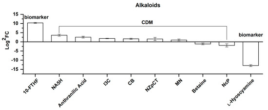 Of the 10 differential alkaloids screened, seven were upregulated and three were downregulated (Figure 13). Figure 13 shows these alkaloids in the order of their FC value from left to right, and they consist of two biomarkers and eight CDMs.