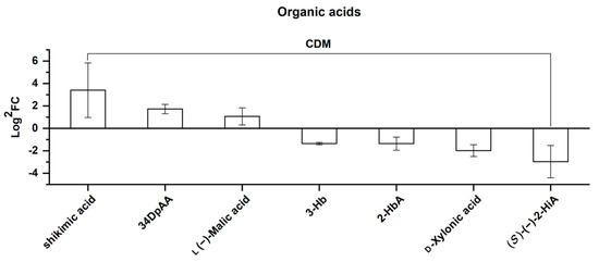 Of the seven differential organic acids screened here, three were upregulated and four were downregulated (Figure 14). As shown in Figure 14, in the order of the FC value from left to right, all were CDMs.