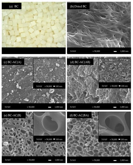 Images of (a) BC and SEM micrograph of surface morphology of (b) dried BC and (c–f) BC-ACs.