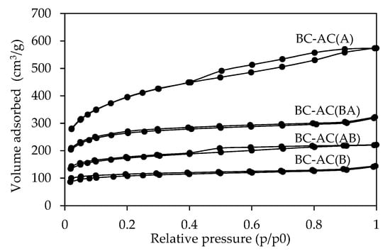 N2 adsorption-desorption isotherms are shown in Figure 3. The BC-AC(A) exhibited a complete hysteresis loop at the relative pressure ≥0.4, whereas the BC-AC(AB) lacked closure of the hysteresis loop below a relative pressure of 0.4, which might be due to the expansion of a mesoporous to macroporous structure []. No hysteresis loops between the adsorption/desorption isotherms exist in BC-AC(B) and BC-AC(BA) due to the very high proportion of macropore volume in the porous structure []. According to International Union of Pure and Applied Chemistry (IUPAC) classification of physisorption isotherms [], the isotherm of BC-AC(A) was type IV, which indicates a mesoporous structure, whereas the isotherms of the BC-AC(AB), BC-AC(B), and BC-AC(BA) were type II, which are associated with a macroporous structure.