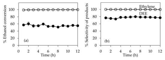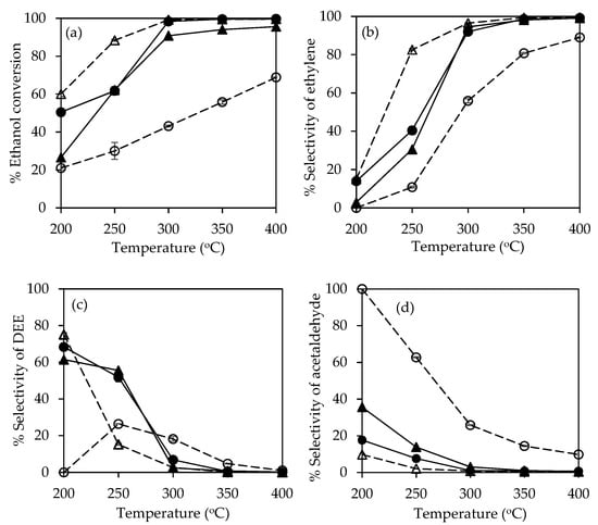 Figure 8a presents the ethanol conversion of 30P/BC-AC catalysts. Similar effects related to reaction temperature and acidity of catalyst on the ethanol conversion have been previously reported []. The ethanol conversion of all 30P/BC-AC catalysts increased with increased reaction temperature from 200 °C to 400 °C because the ethanol dehydration reaction is an endothermic reaction that favors high temperature condition for the conversion of ethanol to ethylene []. The high conversion of ethanol at 100% was obtained by using 30P/BC-AC(BA) and 30P/BC-AC(A) at a reaction temperature of 350–400 °C. At lower reaction temperatures (below 350 °C), 30P/BC-AC(BA) shows a higher conversion of ethanol than the other catalysts. Overall, 30P/BC-AC(BA) gave the highest catalytic activity, i.e., 60.1% of ethanol conversion at reaction temperature of 200 °C, and 88.4–100% of ethanol conversion at reaction temperature of 250–400 °C. Although 30P/BC-AC(A) had more weak acid sites as compared to 30P/BC-BC500(BA), it was shown that, with the higher macropore volume and porosity, the enhanced mass transfer inside the catalyst could be promoted, resulting in effective overall catalytic activities of 30P/BC-BC500(BA). Owing to suitable porous structure, the reactants can easily diffuse into the catalyst pores and are converted to products at active sites [], and the obtained products can easily diffuse out of the catalyst. The interconnected micro-, meso-, and macroporous structure gives the catalyst with a high number of active sites and high internal diffusion.