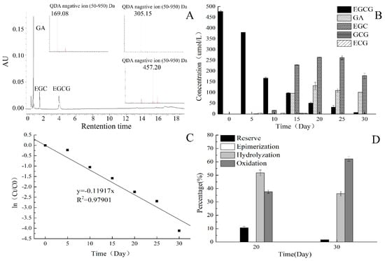 After storing for 20 days, the substrates and products in the incubation system were analyzed using ultra-performance liquid chromatography coupled with a photo-diode array detector and QDA mass detector (UPLC-PDA-QDA); their representative chromatograms are shown in Figure 1A. Classical negative ESI (Electrospray Ionization) mass spectra of gallic acid (GA), EGC, and EGCG are also shown in Figure 1A to verify the reliability of the qualitative analysis. Moreover, the time course of EGCG and products is shown in Figure 1B. As shown in Figure 1B, gallocatechin gallate (GCG), ECG, EGC, and GA were detected after 5 days. EGC, ECG, and GA are hydrolysates of EGCG, and GCG is isomer of EGCG. EGCG underwent hydrolysis and epimerization during storage at 25 °C. The concentration of EGCG decreased, while EGC and GA increased and then decreased during storage.