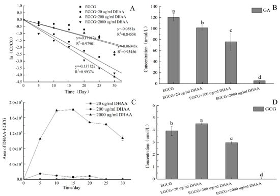 The effect of different dehydroascorbic acid (DHAA) amounts on the EGCG stability: (A) Apparent first-order kinetics of EGCG degradation of four incubation systems; (B) effect of DHAA on the concentration of GA at the end of reaction (p < 0.05); (C) changes of DHAA–EGCG area during storage; (D) effect of DHAA on the concentration of gallocatechin gallate (GCG) at the end of reaction. Date represent means ± SD of three replicate samples. Different letters indicate significant differences according to Duncan’s multiple range test (p < 0.05).