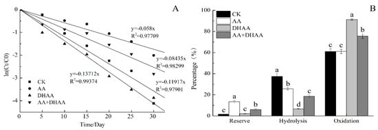 The effect of ascorbic acid (AA) and dehydroascorbic acid (DHAA) on the EGCG stability: (A) Apparent first-order kinetics of EGCG degradation of four incubation systems; (B) significant analysis of conversion pathway in different incubation systems. Date represent means ±SD of three replicate samples. Different letters indicate significant differences according to Duncan’s multiple range test (p < 0.05).