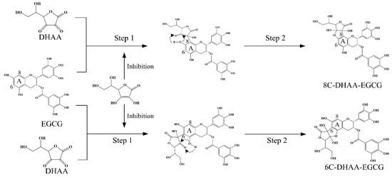 The mechanism of DHAA inhibiting hydrolysis of EGCG was not clear. It may be related to the combination of DHAA and EGCG. The reaction of the carbonyl group at C-2 in DHAA to generate the key intermediate 6C- or 8C-adduct inhibited the loss of the gallate group.