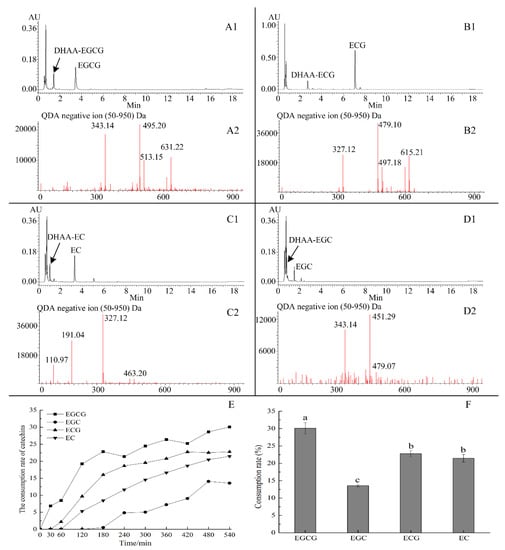 Chromatograph profile and mass spectrum of ascrbyl adducts of catechins. (A1,B1,C1,D1) represent the liquid chromatogram of ascorbyl conjunctions of (−)-epigallocatechin gallate (EGCG), (−)-epicatechin (EC), (−)-epicatechin gallate (ECG), and (−)-epigallocatechin (EGC). (A2,B2,C2,D2) represent the negative mass spectrum of ascorbyl conjunctions of EGCG, ECG, EC, and EGC, respectively. (E) represents the changes of consumption rate of four catechins during storage. (F) represents the consumption rate of four catechins at 540 min. Date represent means ± SD of three replicate samples. Different letters indicate significant differences according to Duncan’s multiple range test (p < 0.05).