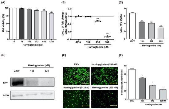 Figure 1. Antiviral activity of harringtonine against Mosquito-borne Zika virus (ZIKV). The cytotoxicity of harringtonine-treated Vero cells for 48 h was determined by Cell Counting Kit 8 (CCK-8) assays. The viability was determined with a Cell Counting Kit 8 assay. The experiments were carried out in triplicates, and the error bars represent standard deviation (A). Vero cells were infected with ZIKV and were treated with different concentrations of harringtonine for 48 h. The anti-ZIKV ability of harringtonine was analyzed by measuring viral RNA levels (B). The cell supernatants were harvested, and virus titers were assessed by fluorecent focus assay (C). The intracellular protein expression of Env was assessed by western blot (D). The severity of ZIKV infection was determined by IFA (E) and quantification of Vero cells (F). Statistical significance was analyzed from t-test compared with the ZIKV group: * p < 0.05; ** p < 0.01; *** p < 0.001. Scale bar: 50 μm.
