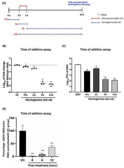 Figure 2. Time of addition assay. Timeline of time of addition assays. The red line refers to the ZIKV absorption period and dotted blue line refers to the harringtonine administration period (A). ZIKV RNA levels were determined using RT-qPCR at different infection processes (B). Virus titers in supernatants were determined using fluorescent focus assay (FFA) (C). The 625 nM of harringtonine was added at 0, 6, and 12 hpi (hour post infection). At 24 hpi, the viral RNA level was analyzed by RT-qPCR (D). Statistical significance was analyzed from t-test compared with the ZIKV group: * p < 0.05; ** p < 0.01; *** p < 0.001.