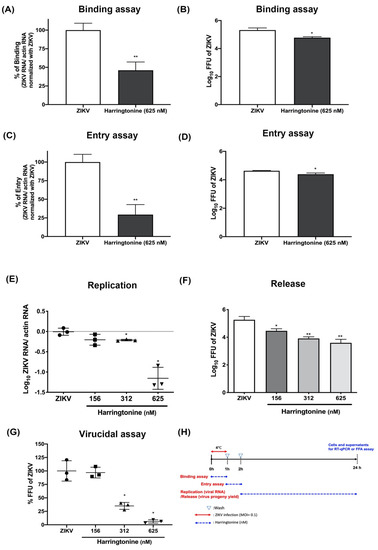 Figure 3. Inhibitory activities of harringtonine against ZIKV stability binding, entry, replication, release, stability in Vero cells. The ZIKV RNA levels and virus titer in supernatants for the binding assay were determined using RT-qPCR and FFA, respectively (A,B). The ZIKV RNA levels and virus titers in cell supernatants for entry assay were determined using RT-qPCR and FFA, respectively (C,D). Fold change of ZIKV replication or release under harringtonine treatment. (E,F). Virucidal activity of harringtonine on ZIKV. Different concentrations of harringtonine were mixed with 3 × 104 fluorescent focus units per mL (FFU) of ZIKV at 37 °C for 3 h. Fluorescent focus assay on Vero cells was carried out to evaluate the virucidal activity of harringtonine on ZIKV (G). Timeline of time of binding, entry, replication and release assays. The red line refers to the ZIKV absorption period and dotted blue line refers to the harringtonine administration period (H). Statistical significance was analyzed from t-test compared with the ZIKV group: * p < 0.05; ** p < 0.01.