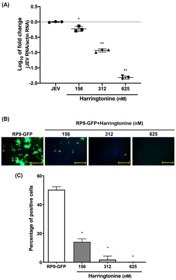 Figure 5. Inhibitory activities of harringtonine against Japan encephalitis virus. Vero cells were infected with (RP9-GFP) and were treated with different concentrations of harringtonine for 48 h. The viral RNA levels were determined using RT-qPCR (A). The inhibitory effects on viral fluorescent protein expression were observed under an inverted fluorescence microscope (B). Quantification of Vero cells (C). Statistical significance was analyzed from t-test compared with the JEV or PR9-GFP groups: * p < 0.05; ** p < 0.01. Scale bar: 50 μm.