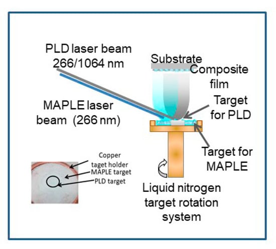 Experimental setup (combined matrix-assisted pulsed laser evaporation and pulsed laser deposition (MAPLE-PLD)) for thin films deposition.