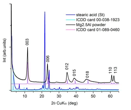The XRD patterns of the primary materials, commercial stearic acid (St) and as-prepared Mg2.5Al-LDH according to the protocol described previously, are presented in Figure 2. The XRD patterns match the standard references from ICDD XRD database: card no 00-038-1923 for the stearic acid and, no. 01-089-0460 for the layered double structure, hydrotalcite-type (Mg0.667Al0.333)(OH)2(CO3)0.167(H2O)0.5, respectively.