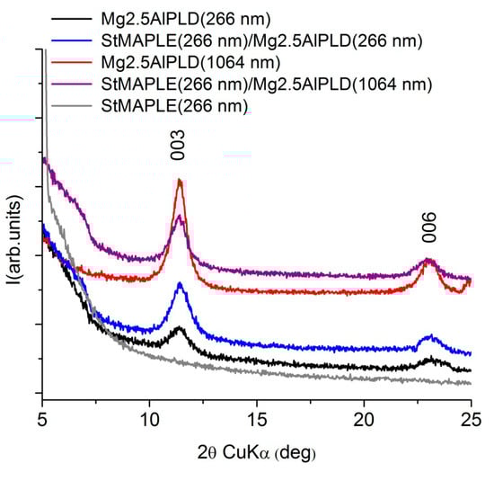 XRD patterns (Figure 3) for the films deposited via combined PLD-MAPLE method reveal the deposition of a (00l) oriented LDH structure similar to our previous results [10,11,12,13,14,15] and to the present single PLD depositions. The lattice c parameter and the coherence length along the c-axis, D003, are included in Table 2. The data inspection shows slightly smaller values of the c parameter for the combined MAPLE-PLD deposition for both wavelengths in comparison with single PLD depositions due probably to the preference for OH- incorporation instead of larger CO32− interlayer anions. We observed also larger D003 values at 1064 nm wavelength PLD deposition in both cases: combined PLD-MAPLE and PLD, respectively. Generally, due to the higher wavelength penetration depth in the target, the 1064 nm wavelength favored the deposition of thicker films [13]. The MAPLE deposition of stearic acid conducted to the formation of an amorphous film.