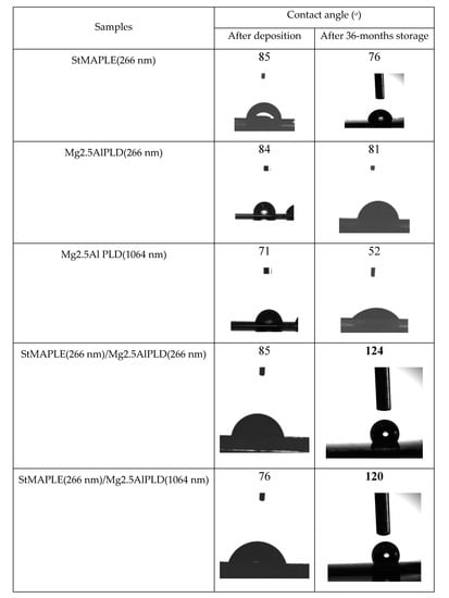 The contact angle values and the photographs of the water droplets on the surface of the as-deposited films are presented in Figure 5. We measured the contact angle on as-deposited films and after 36-months storage. The contact angles (CA) are around 85° for the flat, but low-energy surface of SA film and for the rough surfaces of the films deposited via PLD at 266 nm both single Mg2.5AlPLD(266 nm) and combined by MAPLE addition StMAPLE(266 nm)/Mg2.5Al-PLD(266 nm). The films exhibiting lower roughness obtained via PLD at 1064 nm in both cases single PLD and in combination with MAPLE are more hydrophilic. After 36 months of storage, all the films except the composite films show a decrease of the CA, probably due to moisture and contaminant exposition. The composite films exhibit a significant increase of CA, the films becoming hydrophobic. Coatings preserving their hydrophobic properties after long-time storage are of great interest for their protective function especially for metallic surfaces. There are several papers reported on the transformation of micro-nanostructured metal and metal/oxides from initially hydrophilic to hydrophobic and even super-hydrophobic by air exposure without any other chemical modifications [28,29,30,31,32,33,34]. The explanations are quite diverse. Xiao et.al claimed that after one-month storage, a dense oxide film is formed on Co substrates lowering their surface energy [28]. The transition from super-hydrophilic to super-hydrophobic of a Ni micro-nano cones array surface were attributed by Geng et al. to the formation of NiO during the two weeks storage [29]. For Wang et al. [30], the increase of the contact angle to super-hydrophobicity of nanostructured CuO film during three weeks of air exposure might be caused by the physical adsorption of oxygen molecules on the surface. S. Korsand et al. [31,32,33] attributed the wettability transition from a super hydrophilic nature to a super-hydrophobic one of Ni films and Ni-Co films mainly to their very particular hierarchically micro-nano structure, which, by allowing air to be trapped in rough surfaces during the two weeks exposure to air, will form convex surface between the interface of liquid and air. For the Ni-Co alloy coatings, the surface adsorption of air-borne hydrocarbons [32,33] is also considered similar to Li et al. for several metal, Cu, Ni, Au, etc. as a cause of increased super-hydrophobicity by their effect of reducing the surface free energy [34]. After reaching super-hydrophobicity the Ni-Co alloy coatings exhibit long time durability, the coatings being air exposed more than 4 months [32]. Mg2.5AlPLD(266 nm) film exhibiting higher roughness (RMS) and a morphological-like appearance as the composite StMAPLE(266 nm)/Mg2.5AlPLD(266 nm) (Table 2 and Figure 4) undergoes no increase of CA in 36 months of storage, while the composite film becomes hydrophobic. In the same time, the other composite sample StMAPLE(266 nm)/Mg2.5AlPLD(1064 nm) with smaller roughness and different morphological aspect (Table 2, Figure 4) reveals a similar transition to hydrophobicity after long-time storage. The deposition of the stearic acid via MAPLE and of the Mg2.5Al-LDH occurred simultaneously; thus, the resulting composite films consist more likely in very disperse SA small aggregated embedded between the LDH layers.
