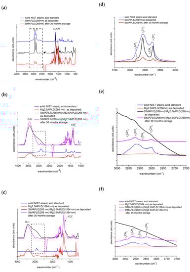 FT-IR spectra of as deposited films, of the stearic acid deposited via MAPLE (a) and of the composite films deposited via a combined MAPLE-PLD deposition (b) and (c). The FT-IR spectrum of the solid NIST (National Institute of Standards and Technology-US) is included. In the right column, the detailed spectra from 3000–2700 cm−1 wavenumbers are exposed, emphasizing the νaCH2 and the νaCH3 bands (d), (e) and (f), respectively.