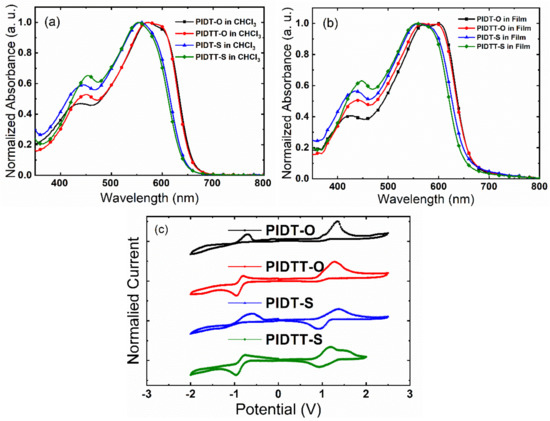 (a) UV-visible spectra in chloroform and (b) in film, (c) Cyclic voltammograms curves of PIDT-O, PIDTT-O, PIDT-S and PIDTT-S.