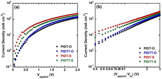 (a) The J-V curves of hole-only devices for neat polymers, and (b) fitting results to (a) from the SCLC model.