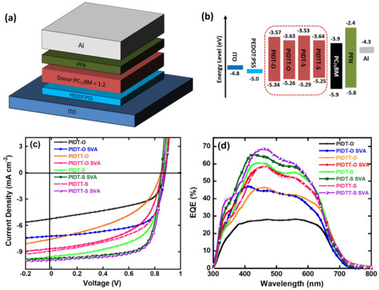 To investigate the photovoltaic performance, the BHJ PSCs with PIDT-O, PIDTT-O, PIDT-S and PIDTT-S as electron donors were explored in detail, whereby the fullerene derivative PC71BM was used as the electron acceptor. The relatively conventional devices were assembled with a configuration of ITO/PEDOT: PSS (40 nm)/active layer (80–100 nm)/PFN (5 nm)/Al (100 nm) as presented in Figure 4a. The donor/acceptor (D/A) weight ratio was 1:2 for all the BHJ PSCs. The energy diagrams of the acceptor PC71CM was shown in Figure 4b with HOMO and LUMO levels of −5.9, and −33.9 eV, respectively. The difference of LUMOs between the donor and acceptor materials is near above 0.3 eV, which is sufficient for charge separation [26,27]. Through photovoltaic characterization, the J-V curves were recorded in Figure 4c and the corresponding data were summarized in Table 4. It is noted that the devices without any other post-treatment show lower PCEs of 2.41%, 2.89%, 5.09% and 4.43% for PIDT-O, PIDTT-O, PIDT-S, and PIDTT-S, respectively. Based on these devices, all of them give the high Vocs over 0.85 V ascribing to their lower HOMO energy levels. Compared with the PIDT-O and PIDTT-O based devices, the ones based on PIDT-S and PIDTT-S display the higher PCEs, possibly resulting from their higher hole mobilities than PIDT-O and PIDTT-O. The higher hole mobilities would supply the better hole transport channel and suppress the negative charge carriers recombination in the BHJ systems.