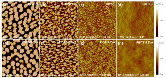 Surface topographic AFM images of polymer: PC71BM blend films (a) PIDT-O, (b) PIDTT-O, (c) PIDT-S, (d) PIDTT-S without SVA treatment, and (e) PIDT-O, (f) PIDTT-O, (g) PIDT-S, (h) PIDTT-S with SVA treatment.