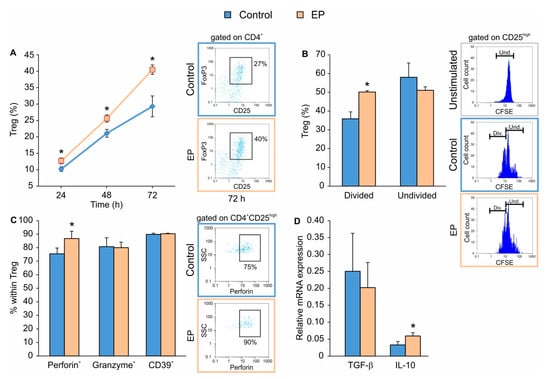 In order to determine the timeline of EP effect on Treg differentiation in vitro, CD4+CD25− cells isolated from spleens of C57BL/6 mice were stimulated with the conventional Treg differentiation cocktail that is comprised of plate-bound anti-CD3 and soluble anti-CD28 antibodies together with IL-2 and TGF-β. At the same time, EP was applied 24 h after the beginning of cell culture. EP increased the proportion of Treg even 24 h after application, while the maximal increase was observed 72 h after EP addition (Figure 1A). The increased number of Treg after EP treatment most likely resulted from the proliferation of already differentiated Treg, rather than from the possible direct impact on Treg differentiation, as determined by carboxyfluorescein succinimidyl ester (CFSE) dilution assay 48 h after EP application (Figure 1B). EP also increased the proportion of Treg that produced perforin, while granzyme production and CD39 (an ATP ecto-enzyme) expression remained unchanged (Figure 1C). The expression of IL-10 mRNA was also increased in the presence of EP, while there was no difference in the expression of TGF-β mRNA between conventionally and EP-induced Treg (Figure 1D).